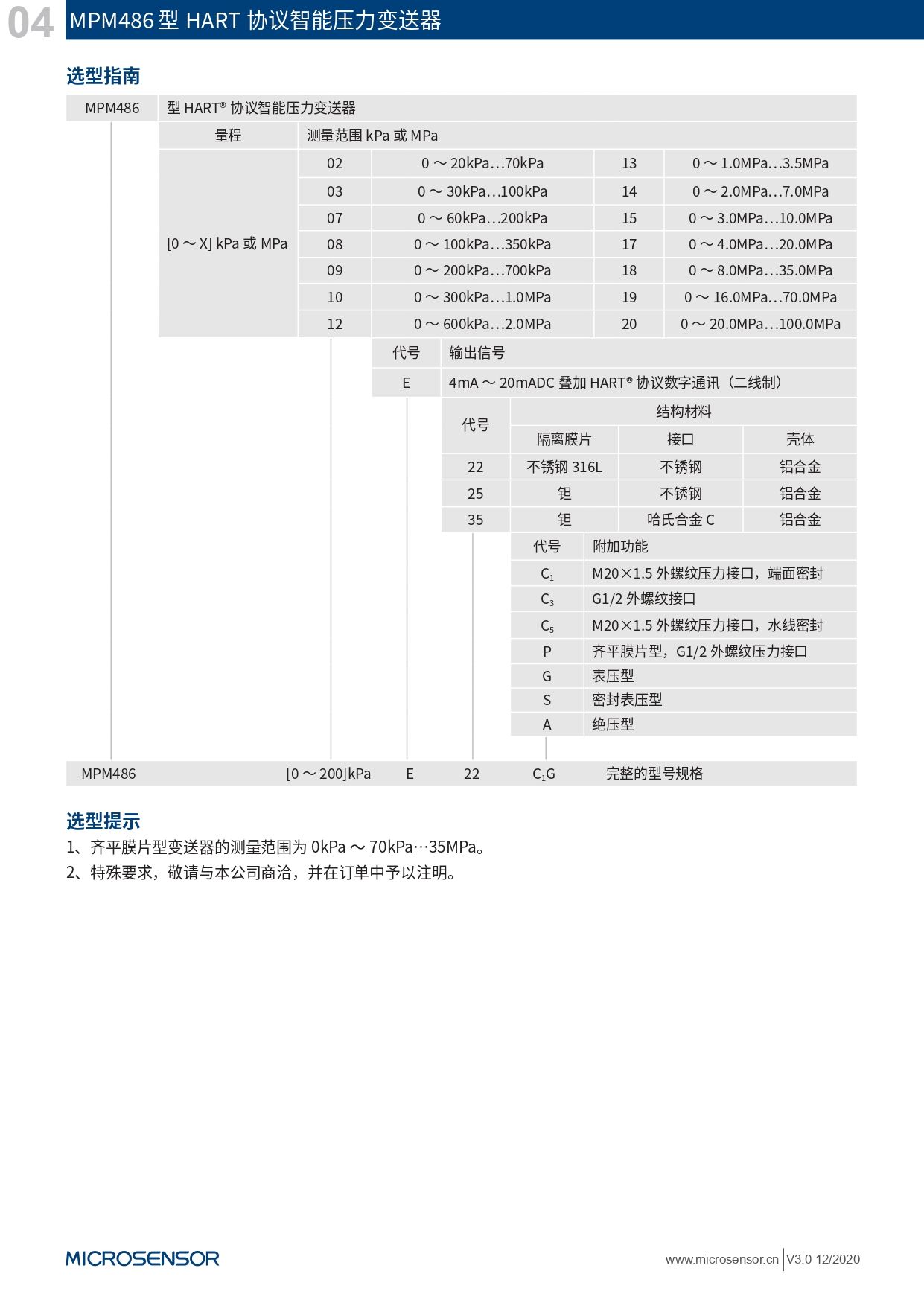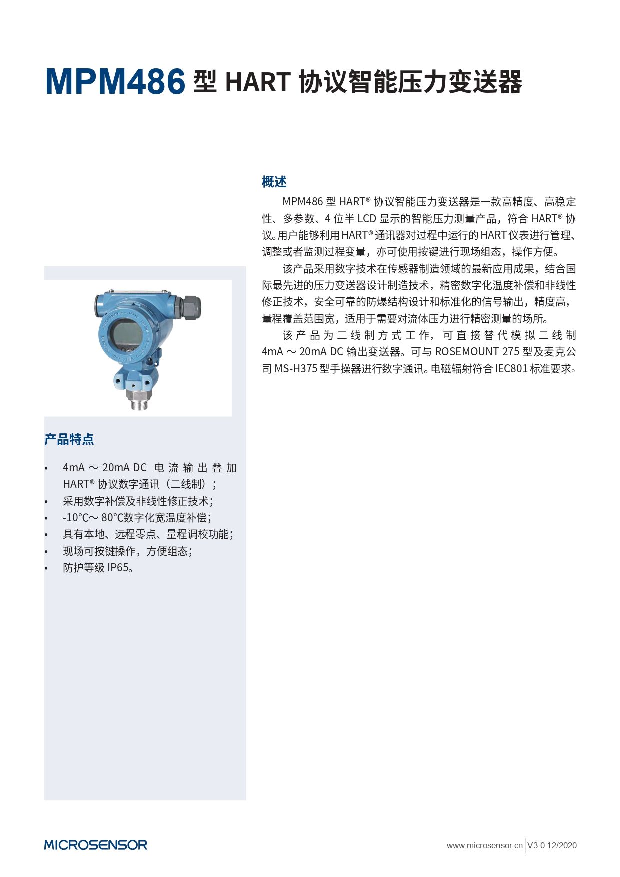 品牌:microsensor 型号:MPM486型 加工定制:否 类型:- 测量介质:- 测量范围:- kPa 精度等级:- 输出信号:- mA 电源电压:- V MPM486型HART协议智能压力变送器