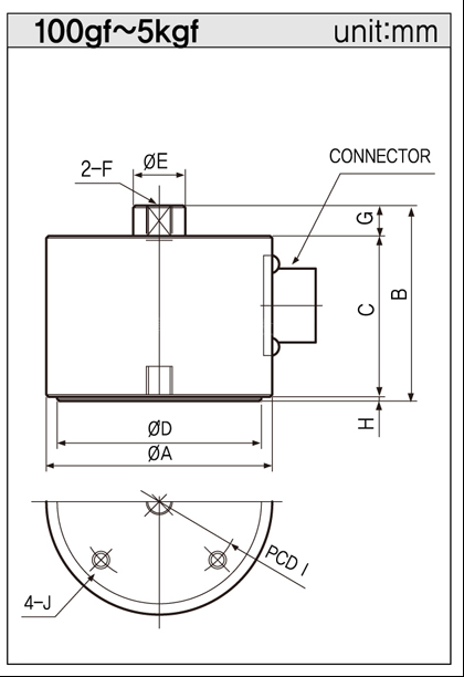 量程及尺寸:量程/CPA(T) ∅A B C ∅D ∅E F G H I J 100g 52 45 37 47 10.5 M4×0.7 DP8 7 1 38 4-M4 DP6 200g 52 45 37 47 10.5 M4×0.7 DP8 7 1 38 4-M4 DP6 500g 52 45 37 47 10.5 M4×0.7 DP8 7 1 38 4-M4 DP6 1kg 52 45 37 47 10.5 M6×1.0 DP8 7 1 38 4-M4 DP6 2KG 52 45 37 47 12 M6×1.0 DP8 7 1 38 4-M4 DP6 5KG 52 45 37 47 12 M6×1.0 DP8 7 1 38 4-M4 DP6
