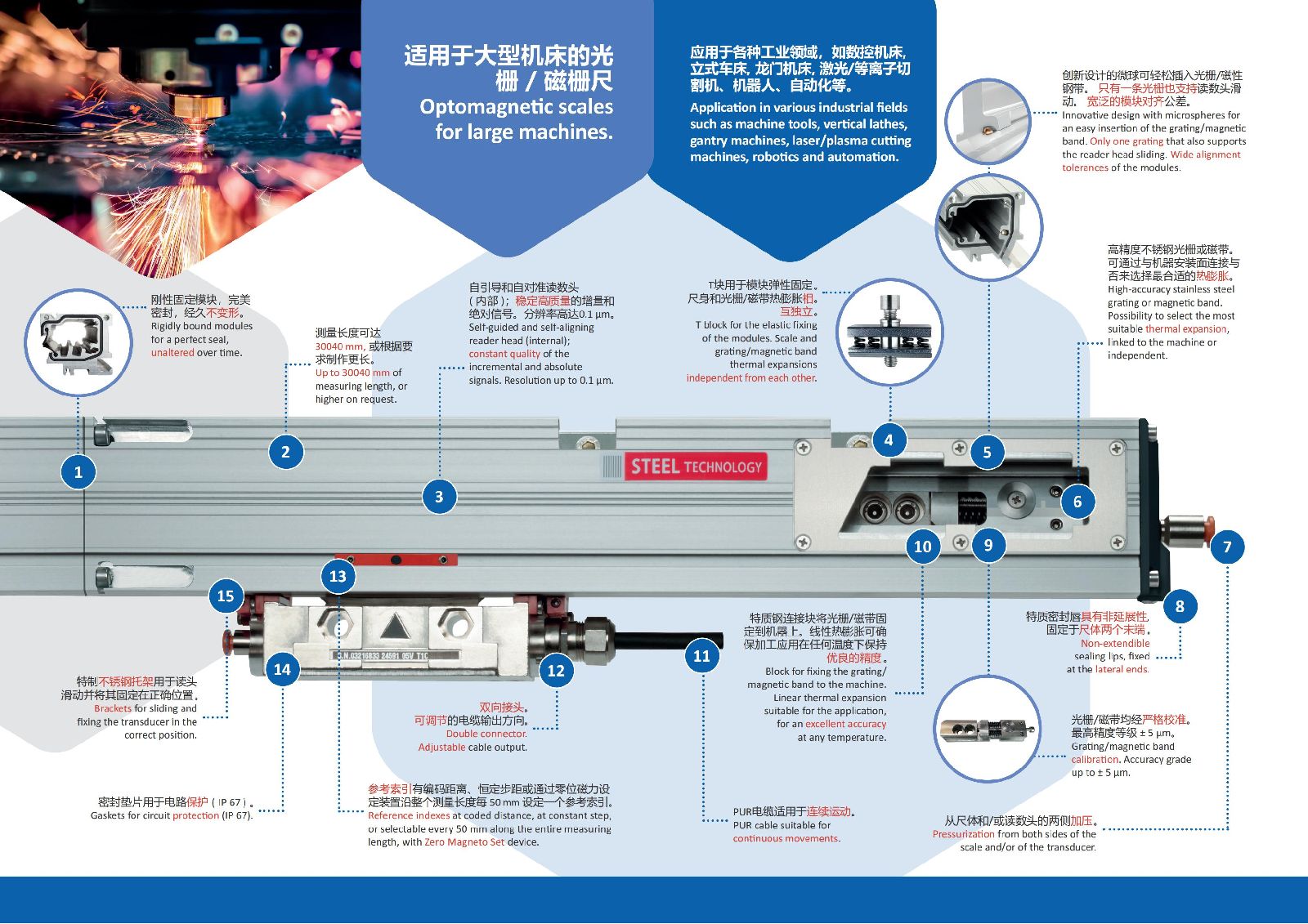 • 磁条敷设于不锈钢带上, 与机器导轨连接一体, 在任何工作温度下都能得到很好的精度。